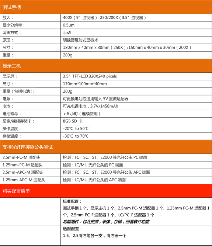 2.5mm APC-M适配器1个、1.25mm APC-M适配器1个、SC/APC-F适配器1个、FC/APC-F适配器1个、LC/APC-F 适配器1个、8G SD卡1个
