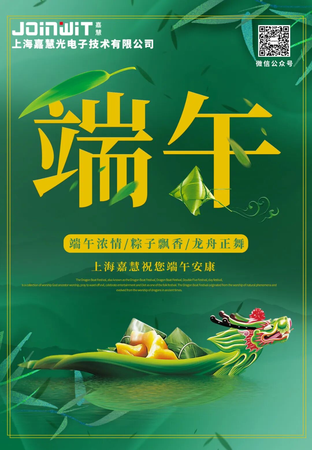 随着六月一日起上海的放开,嘉慧的复工复产也在井然有序地进行中。我们会严格遵守政府及园区防疫规定,做好每一步的防护和消杀。捧一缕初夏阳光,迎着扑鼻棕香;踏上离岸龙舟,送上温馨祝福:祝您端午安康,假期愉快!